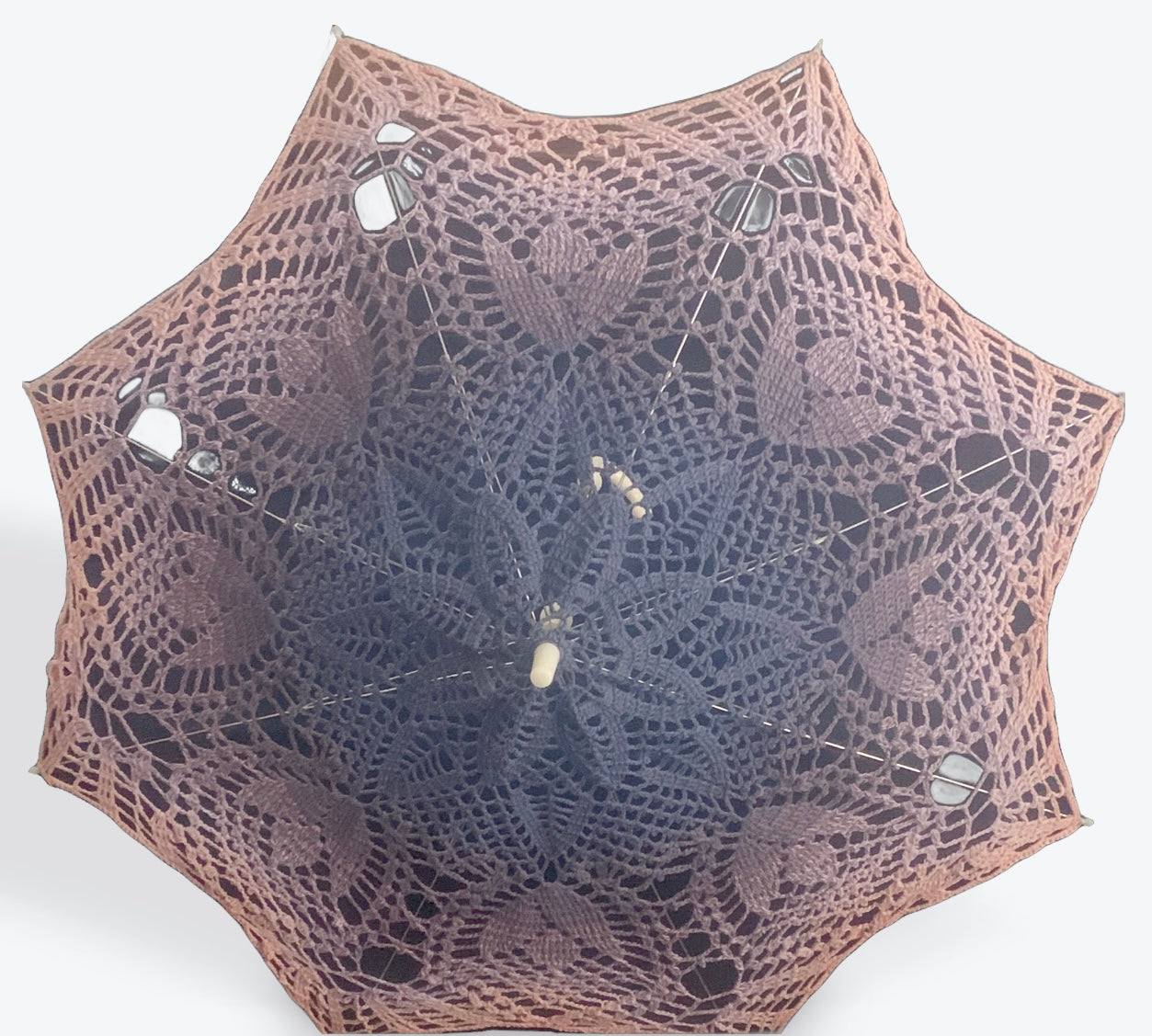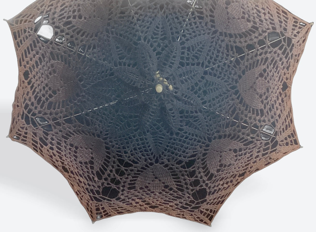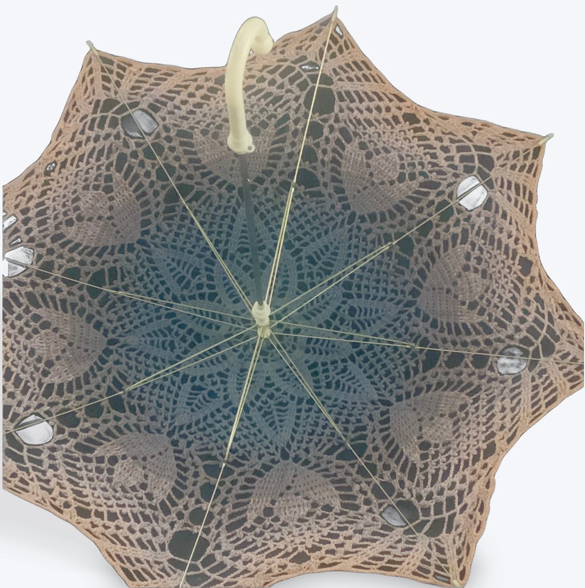 This parasol has a steel main shaft with a white crooked handle and fittings for the top and arm tips. The opener is manual and care should be exercised to ensure the arm tips aren't caught in the crochet mandala before opening.