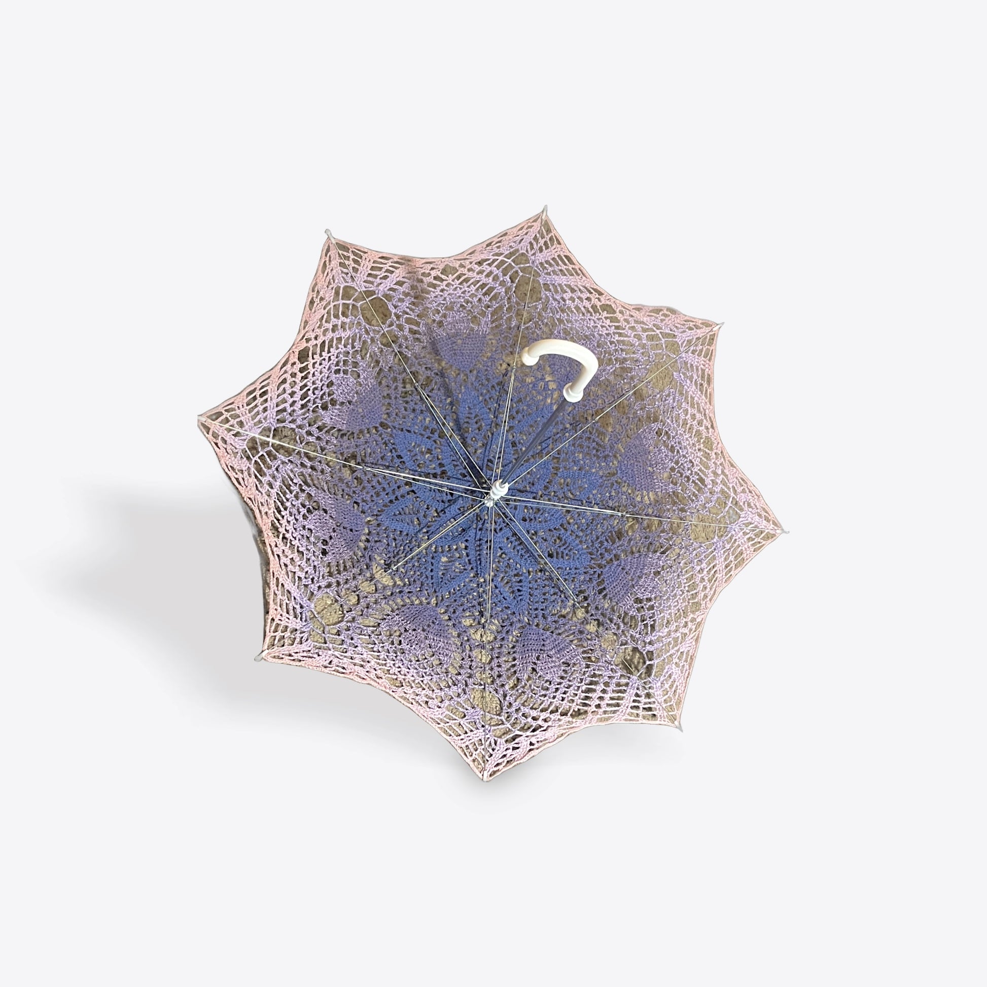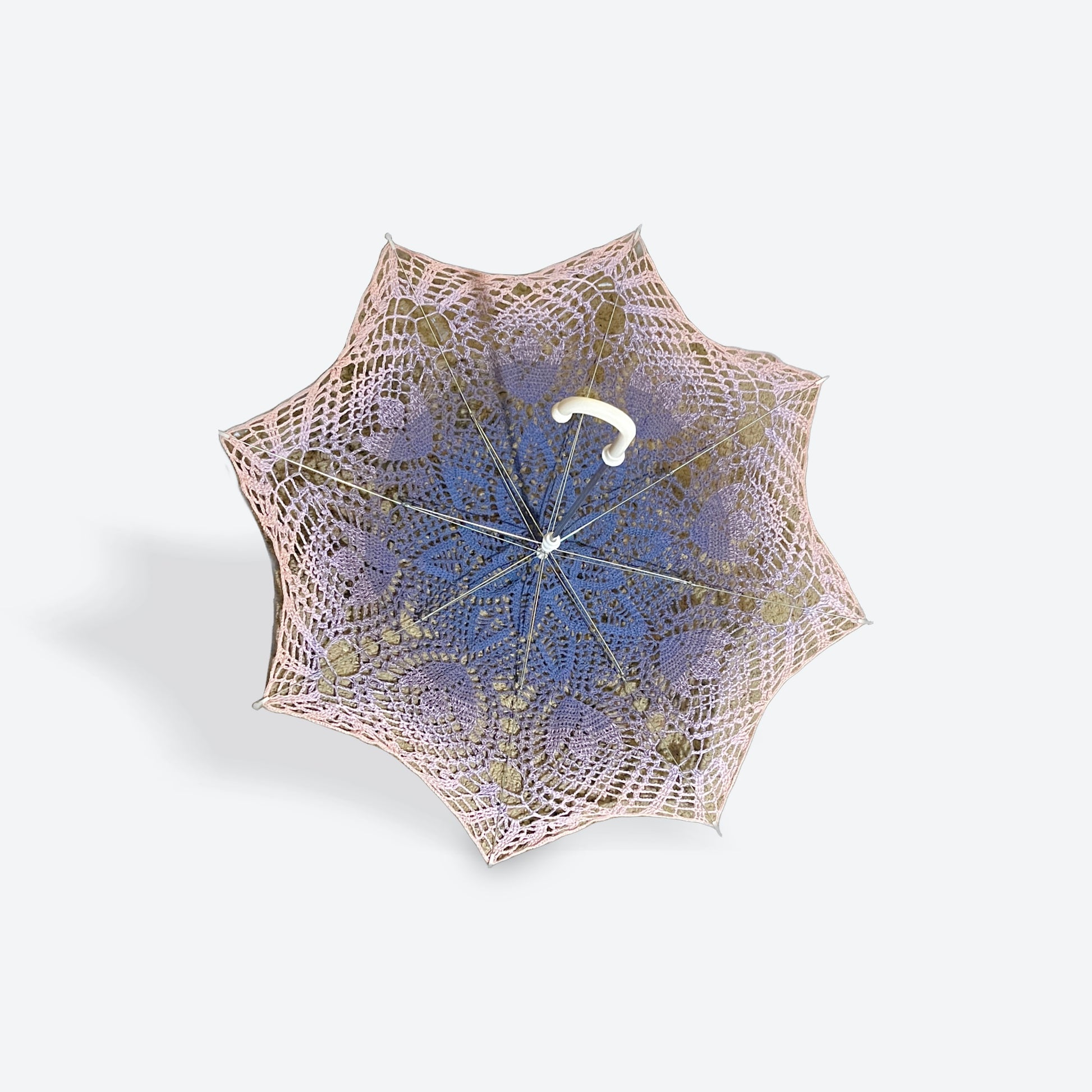 This 30" parasol is a pattern I have developed myself called All Flowers. It begins with daisies at the center followed by a round of leaves, then large tulips, and finally fans. The colorway is unique and its colors seem antiqued to me; they range from a blue-purple at the center to a light pink at the edge.