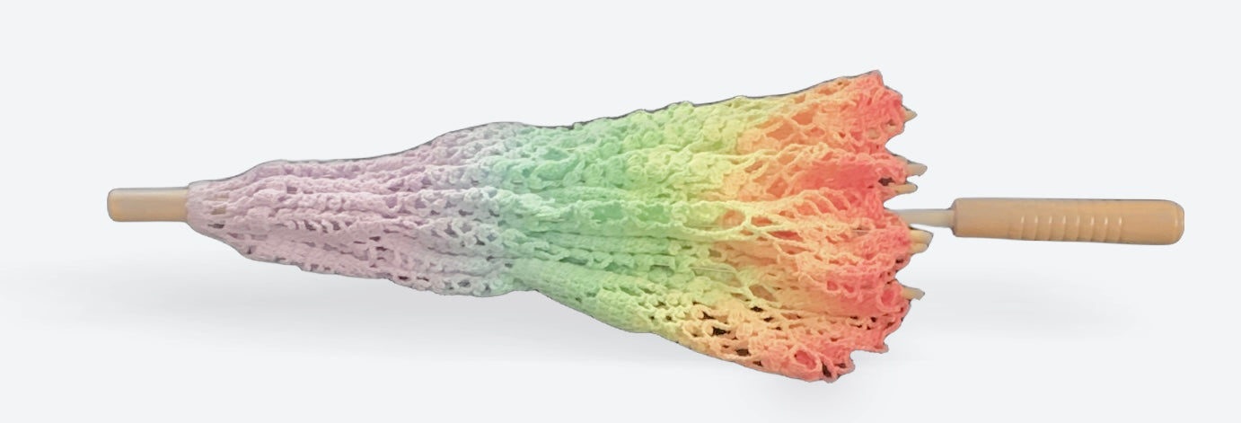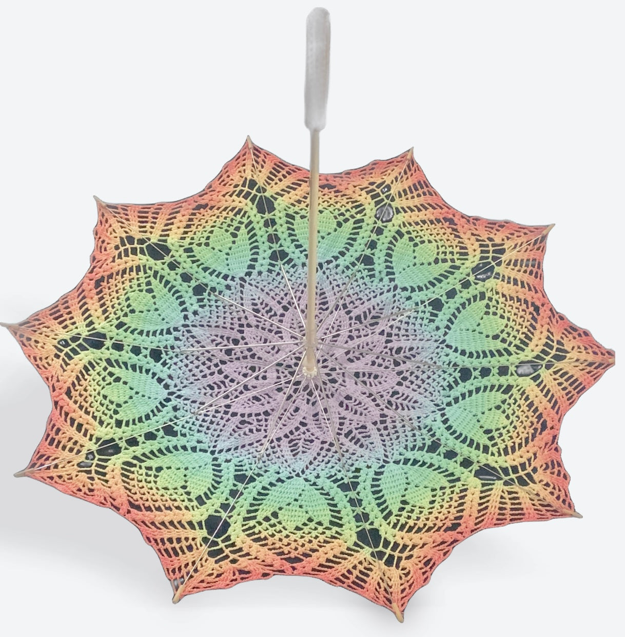 This parasol has a straight handle and wood fittings for the top, arm tips, and handle. The opener is manual. Care should be exercised to ensure the arm tips aren't caught in the crochet mandala before opening.