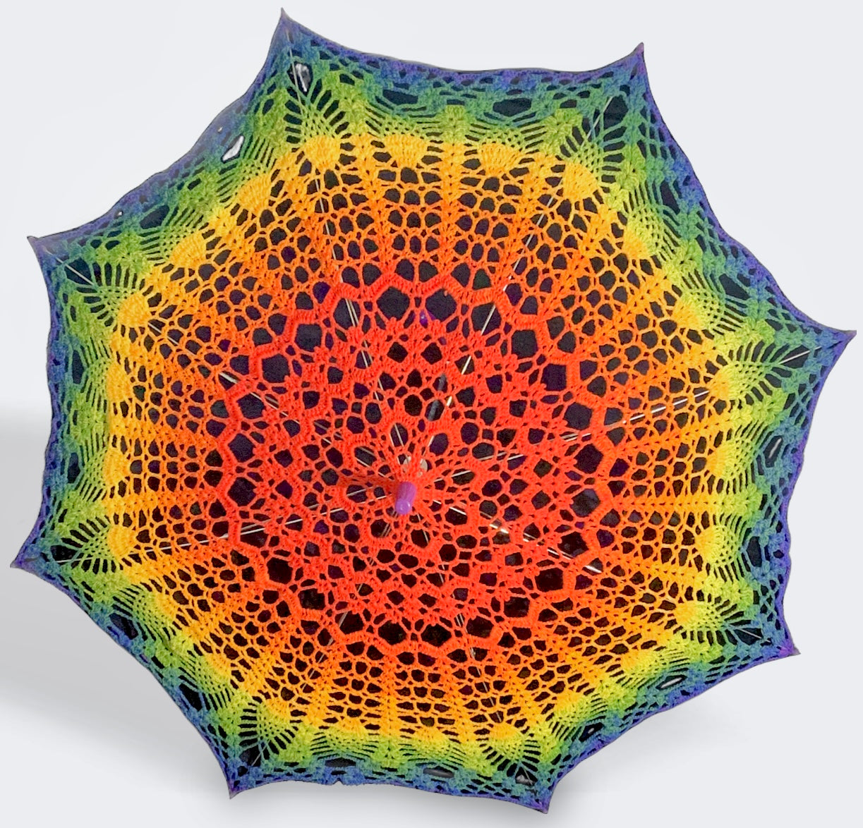 This parasol is 30" in diameter featuring the gay pride rainbow flag. The mandala starts with bright red at the center and gradually fades through the ROYGBIV rainbow until it gets to purple at the edge. The purple is a little thin on the edge of this one, so the parasol details are purple to enhance the color.