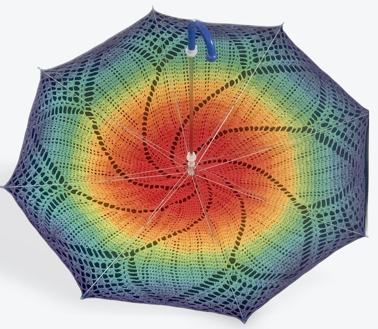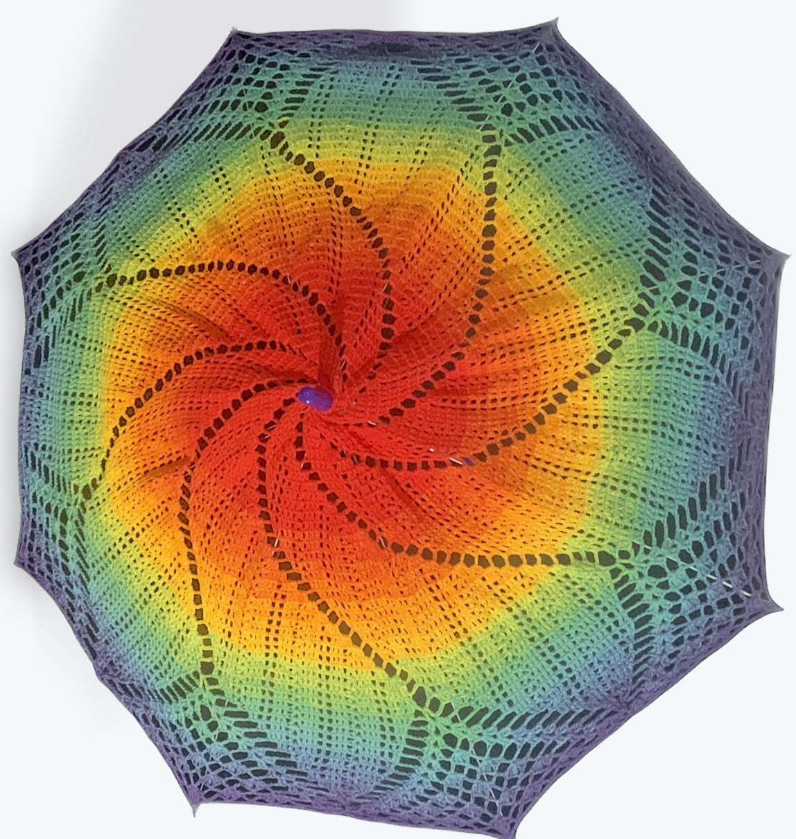 This parasol is 30" in diameter featuring the ROYGBIV Gay Pride rainbow flag. The mandala starts with bright red at the center and gradually fades through the ROYGBIV rainbow until it gets to dark purple at the edge.